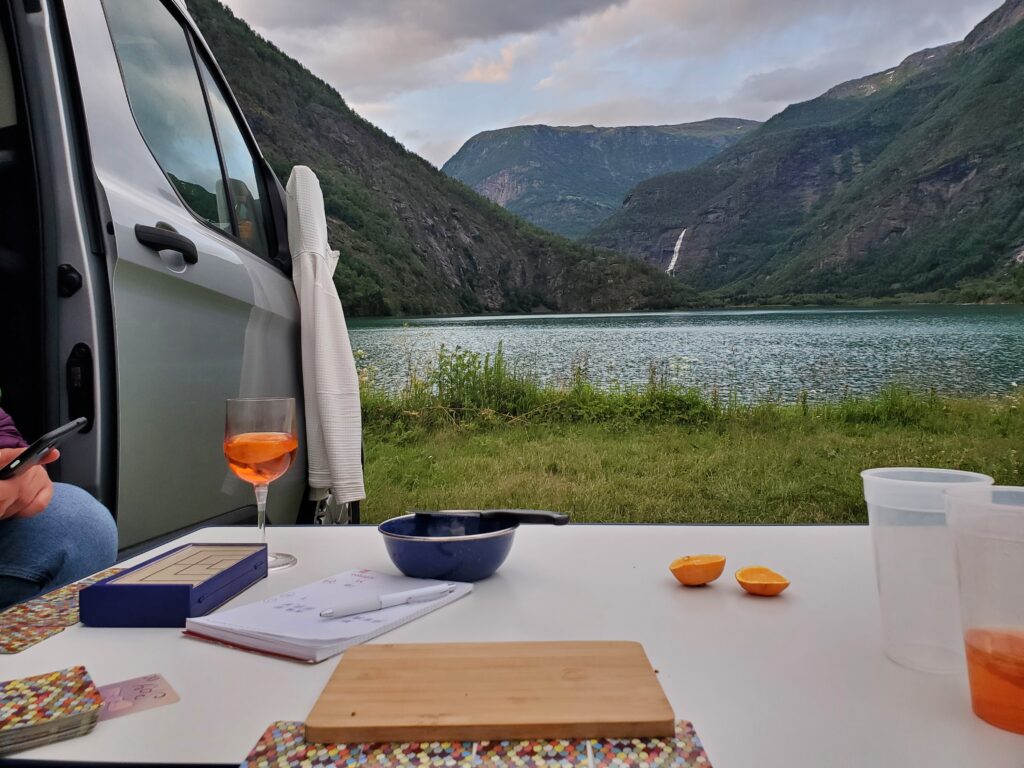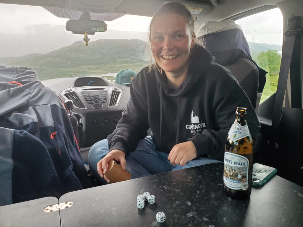 Beim anschließenden Kniffeln versenken wir vor lauter Enthusiasmus (und eventuell auch Aperol Spritz) gleich 2 Würfel im Fjord. Selbst Kathrins Bouldersession bleibt als Rettungsaktion erfolglos.