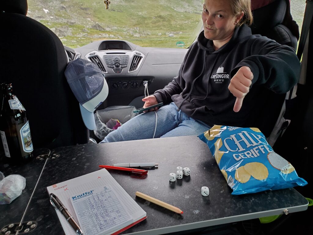 Am höchsten Punkt lässt sich pünktlich die Sonne blicken und es gibt eine verdiente Pause. Die Kathrin zaubert neben nem Passhöhen-Schnaps auch noch unser letztes Bier hervor. Wir spielen ein bisschen Cabo, und die Höhe scheint meine Spielfähigkeiten deutlich zu verbessern.