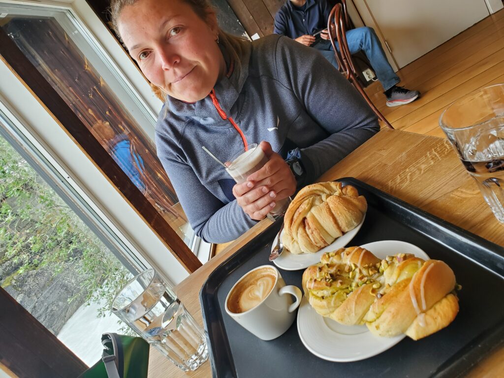 Die Höhenmeter lassen sich leider rückblickend nicht mehr eruieren denn während Google weiterhin von flachen 200m ausgeht übertreibt Kathrins sehr freundliche Sportuhr mit über 800m Anstieg leider so maßlos, dass wir es nicht glauben können, egal wie sehr wir das wollen. Mein angehaltenes Tracking ist leider einer Merinoshirt Anprobe zum Opfer gefallen und war dann gelöscht. So oder so hatten wir ein fantastisches Frühstück mit Zimtschnecke. Egal für wie viel Anstieg.