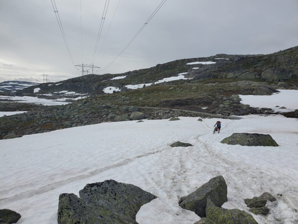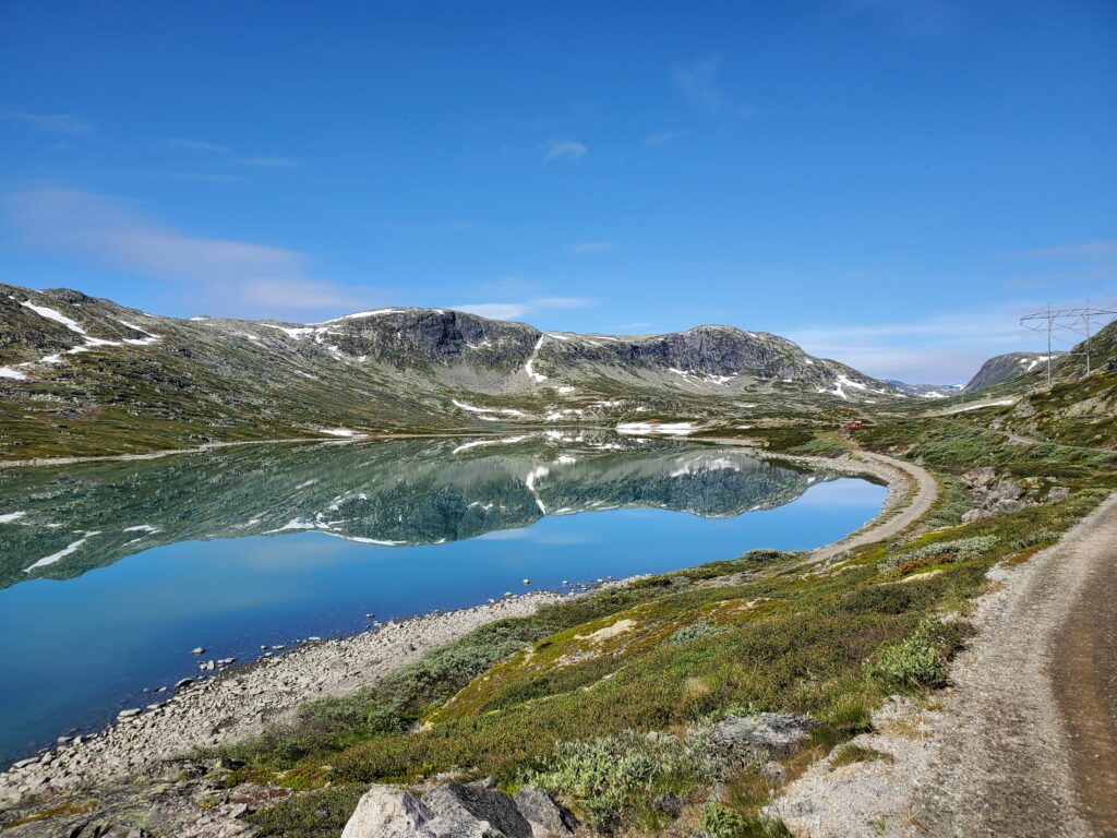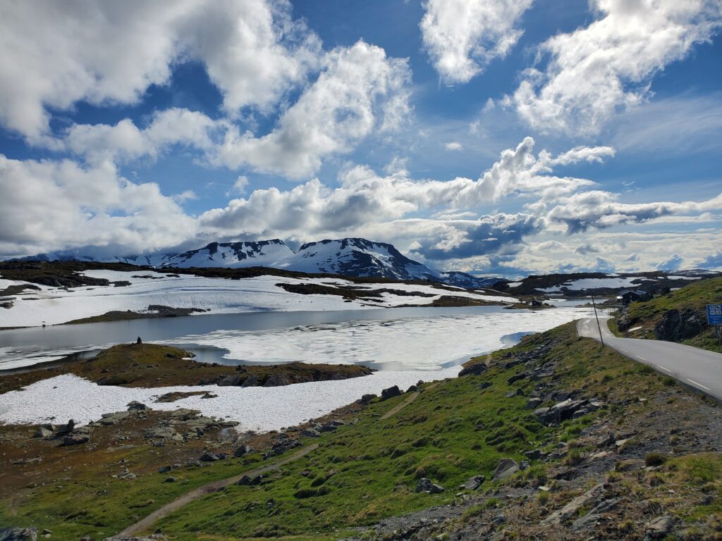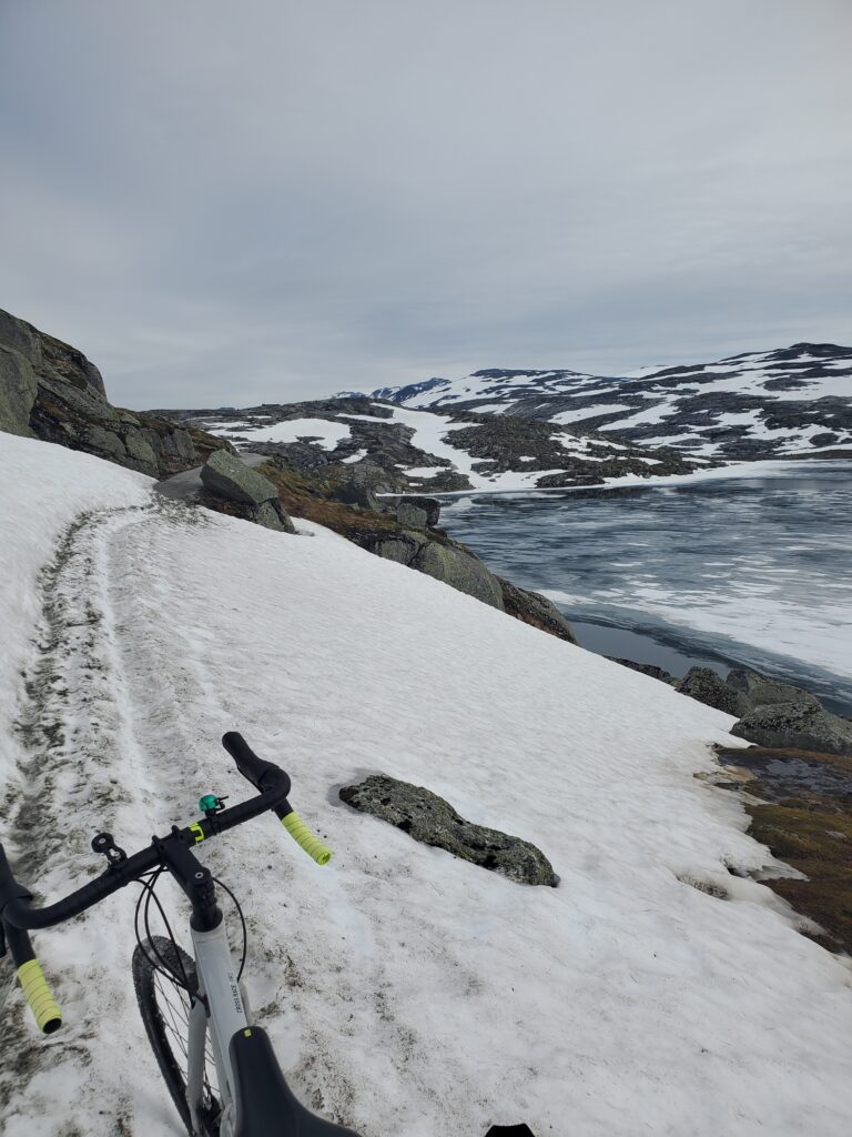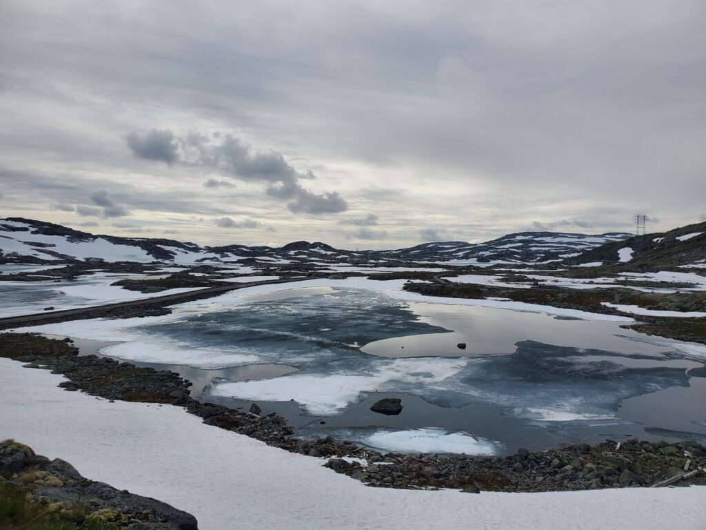 Es geht über Schotter auf und ab durch die wunderschöne Hardangervidda. Mehr auf als ab. Wir mühen uns hoch bis über 1300m. Es wird weißer und es kommen wubderschöne Seen mit Eisschollem zum Vorschein.