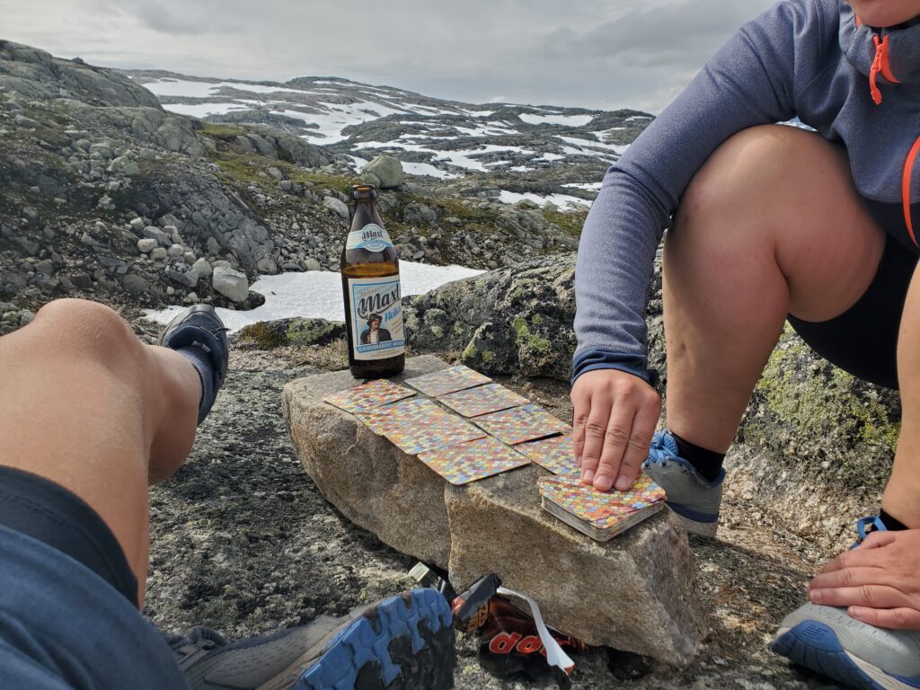 Geilo enttäuscht primär mal durch sein fehlendes Ortsschild. Wir suchen uns frustriert einen schönen Platz am Fluss und spielen stundenlang Cabo denn bis unser Zug kommen soll haben wir noch 4.5 Stunden. Das ganze mündet in einem netten Daydrinking Event da es einen Supermarkt ums Eck gibt. Glücklich machen wir uns schließlich auf zum Bahnhof wo wir mit dem ersehnten “Geilo-Schild” für unsere 2tägigen Strapazen belohnt werden.