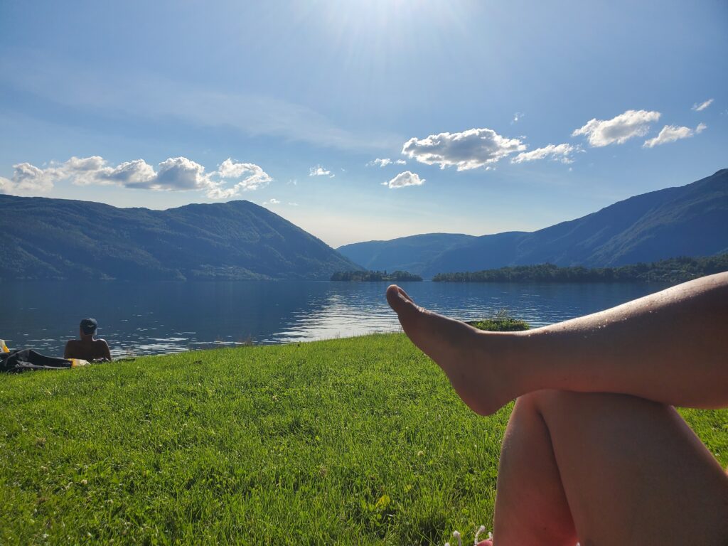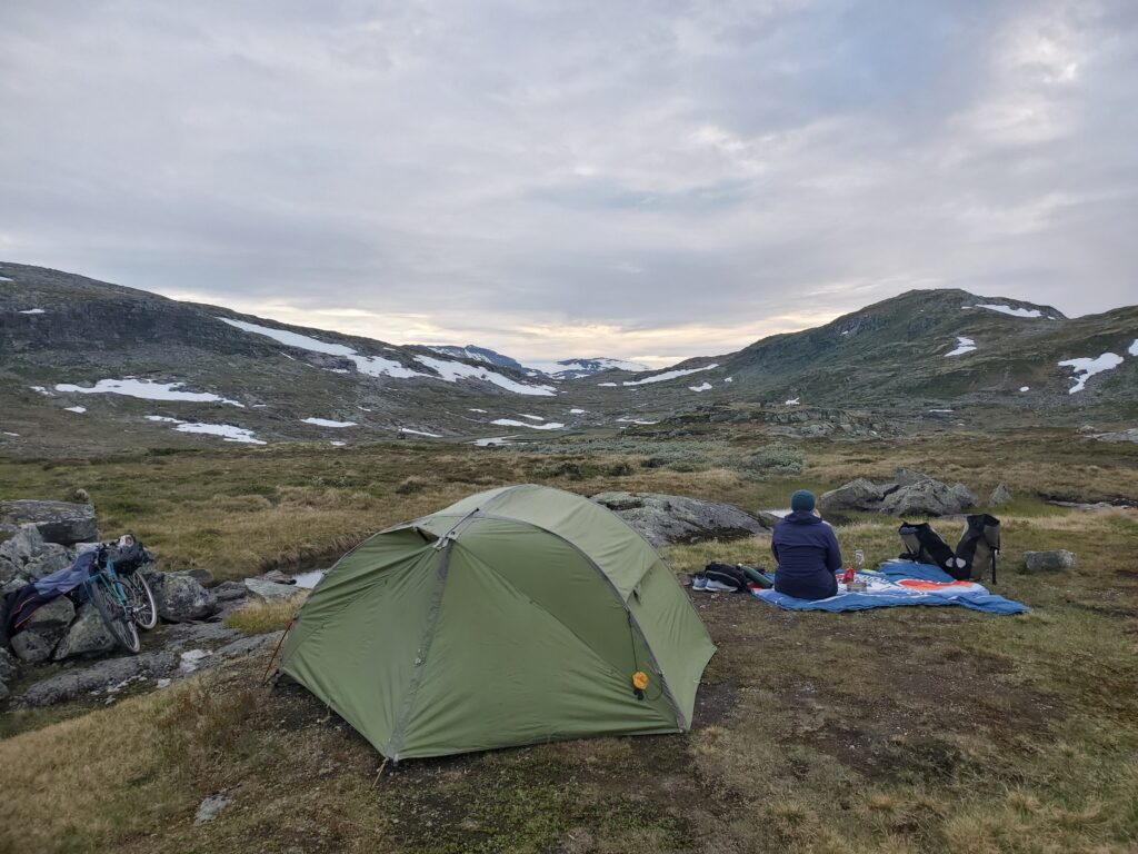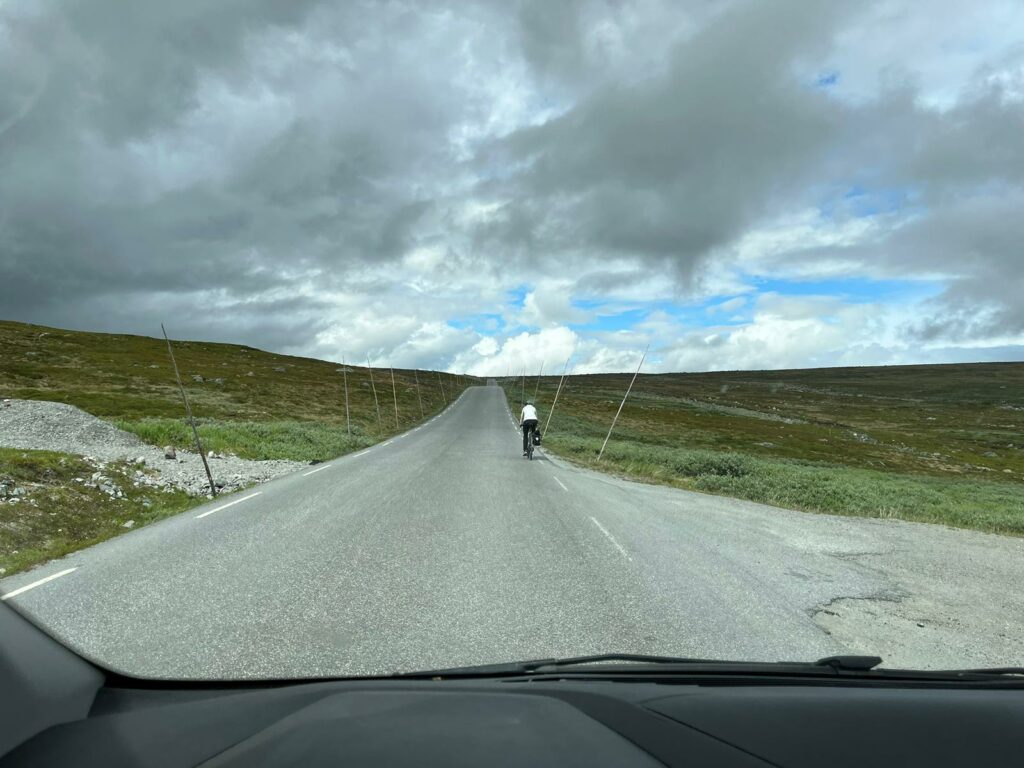 Wir beginnen unseren neuen Tag mit einem Bad im eiskalten See. Die Kathrin weil sie Lust drauf hat. Ich, weil ich wie immer krass FOMO habe. Gut tut es uns beiden. Kathrins Knie ist von ihrem Konzept alle positiven Höhenmeter am ersten Tag zu radeln leider ein bisschen weniger überzeugt als sie. Ihr Plan es bis Haugastol bzw. Geilo einfach nur noch rollen zu lassen und gar nicht zu treten gelingt fast. Wir treffen wieder jede Menge Radler die in die entgegengesetzte Richtung- die einfache Richtung wie allseits bekannt sein sollte- unterwegs sind. Es präsentiert sich eine erstaunliche Vielfalt von wagemutigen Familien mit Kleinkindern bis zu definitiv unterausgestatteten Leihradlern. Es wirs grüner und wärmer.