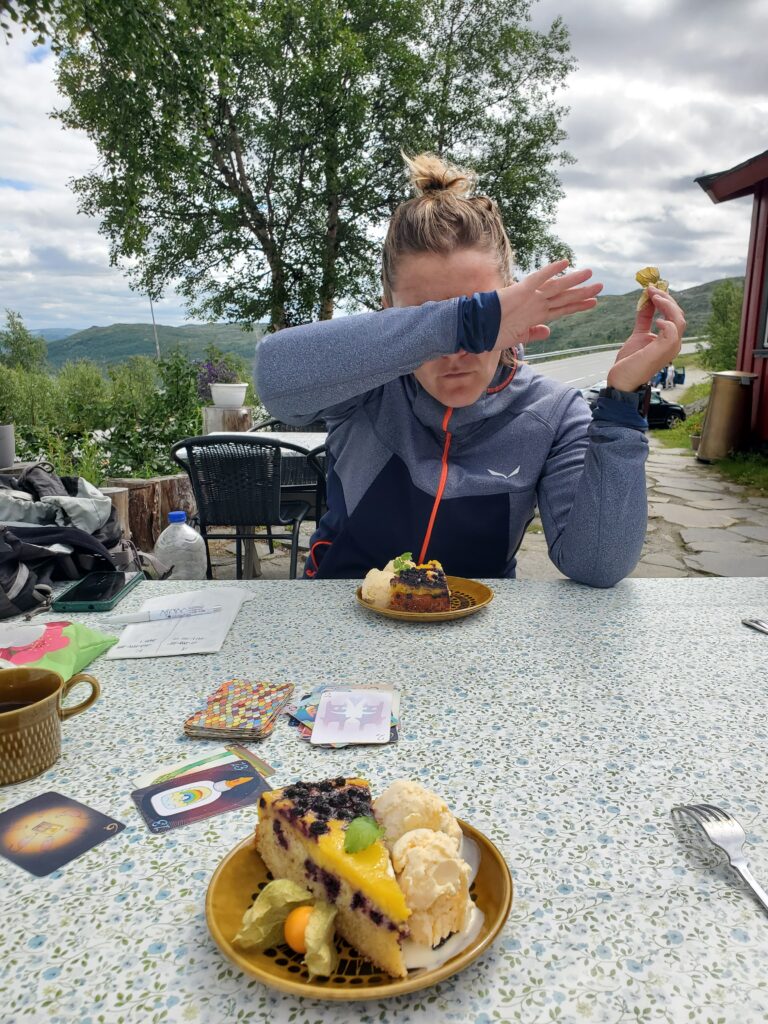 Fröhlich Rollen wir weiter nach Haugastol wo noch weniger los ist als in Finse. Dies führt zu bitterer Enttäuschung bei der Kathrin, ich hatte wohl überambitioniert die Party-Tour versprochen. Wir kehren ins nächste Café ein, dass dummerweise auf einem Hügel liegt. Deshalb fällt der Carbload extra groß aus!