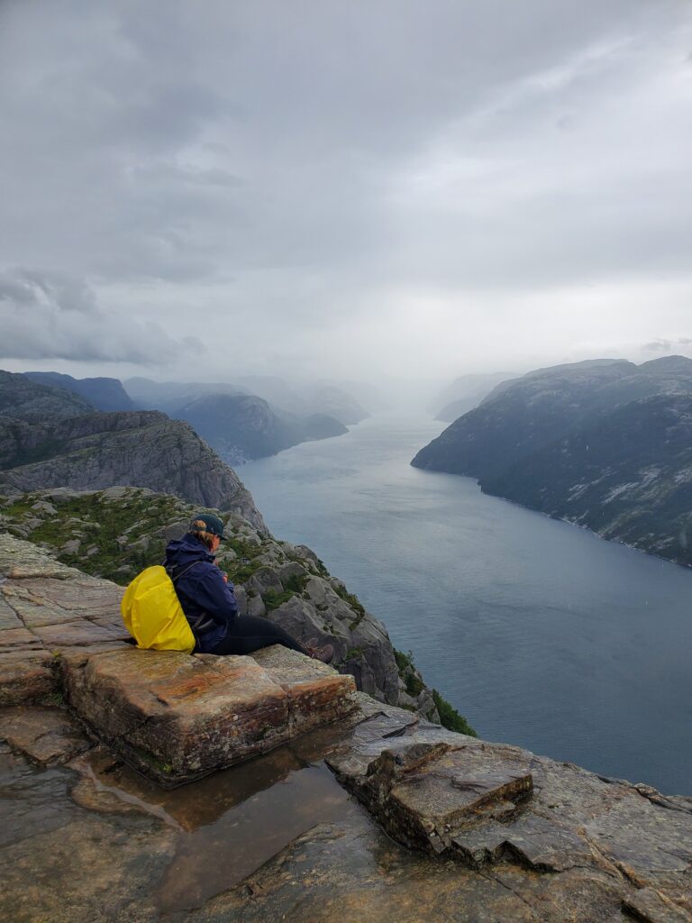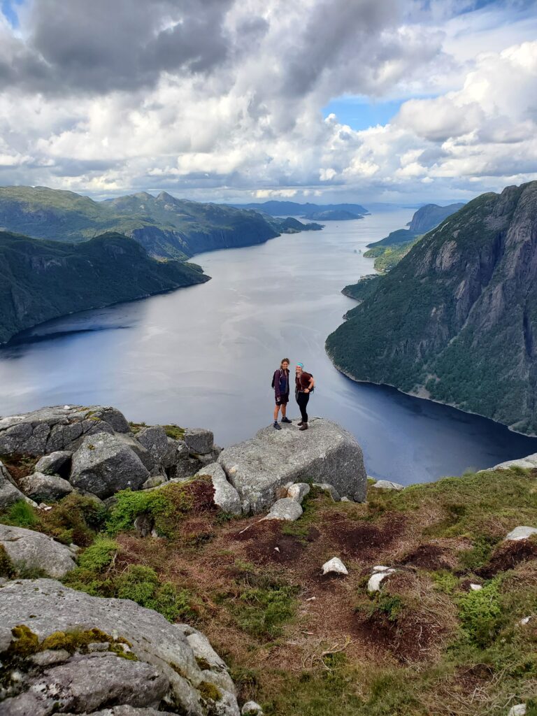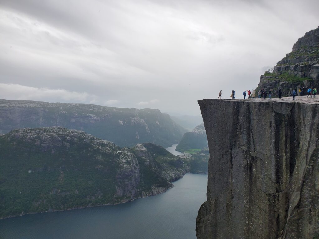 Kathrins Uhr fordert mal wieder sportliche Aktivitäten ein. Deshalb wollen wir am nächsten Tag auf den Preikestolen wandern. Die Wettervorhersage ist durchmischt aber bislang hat uns Niesel ja auch nix gemacht. Daher brechen wir am nächsten Tag top motiviert auf. Weil wir so motiviert sind fahren wir nicht zum standard Parkplatz sondern beginnen die Tour auf Fjordhöhe, also 0m. Die Motivation hält an bis wir wadeltief im Wasser stehen was leider früh zutrifft. Bis wir da ankommen wo die meisten starten haben wir jeder ca. 4l Wasser in unserer Kleidung gespeichert und flüchten erstmal ins Hikers Cafe.