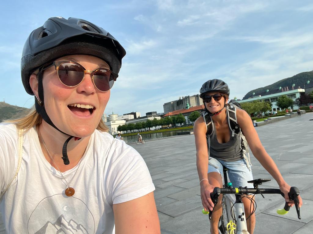 Als wir schon auf dem Rückweg zu unseren Rädern sind legt sich Bergen dann nochmal so richtig ins Zeug und schmeißt sich in Pinktöne. Die Kathrin schaut verträumt auf das Wasser und überlegt, wann sie wieder telefonieren kann. Ihr Plan mich am nächsten Tag wieder radeln zu lassen scheitert am strömenden Regen in der Früh. Ein bisschen Geduld braucht sie also noch!